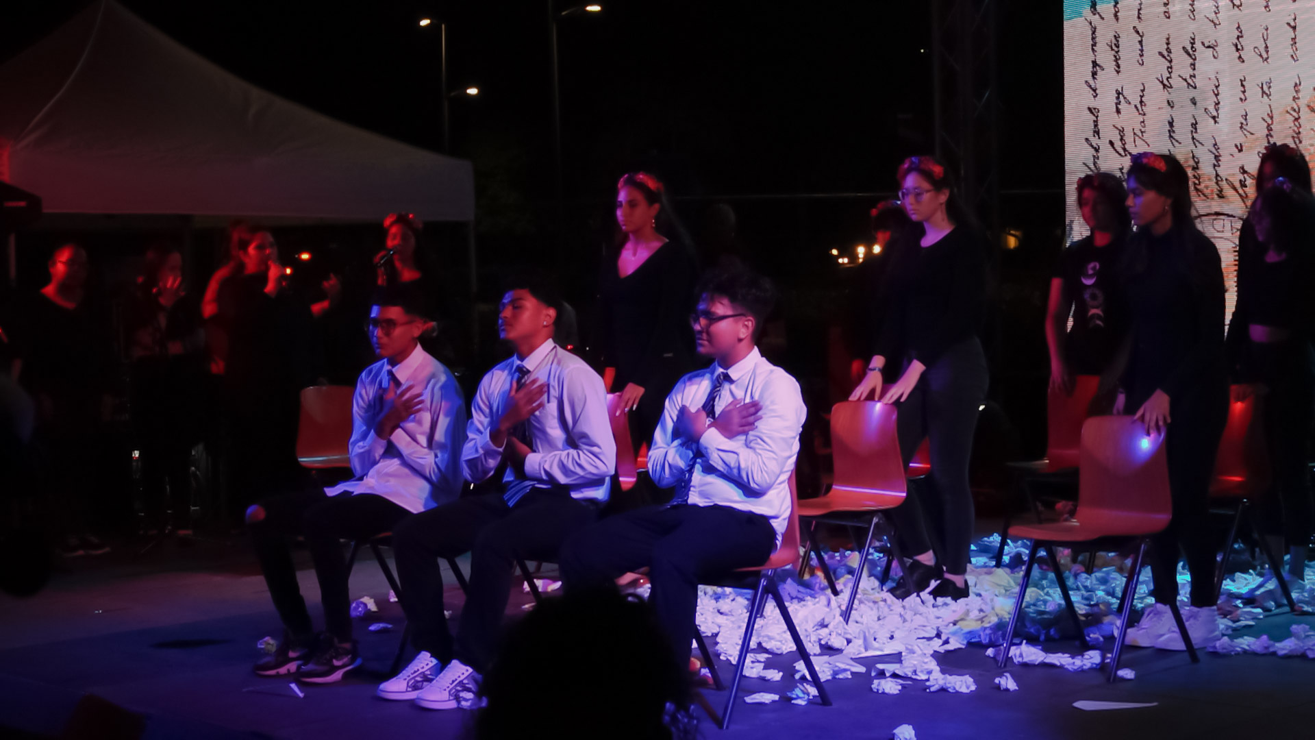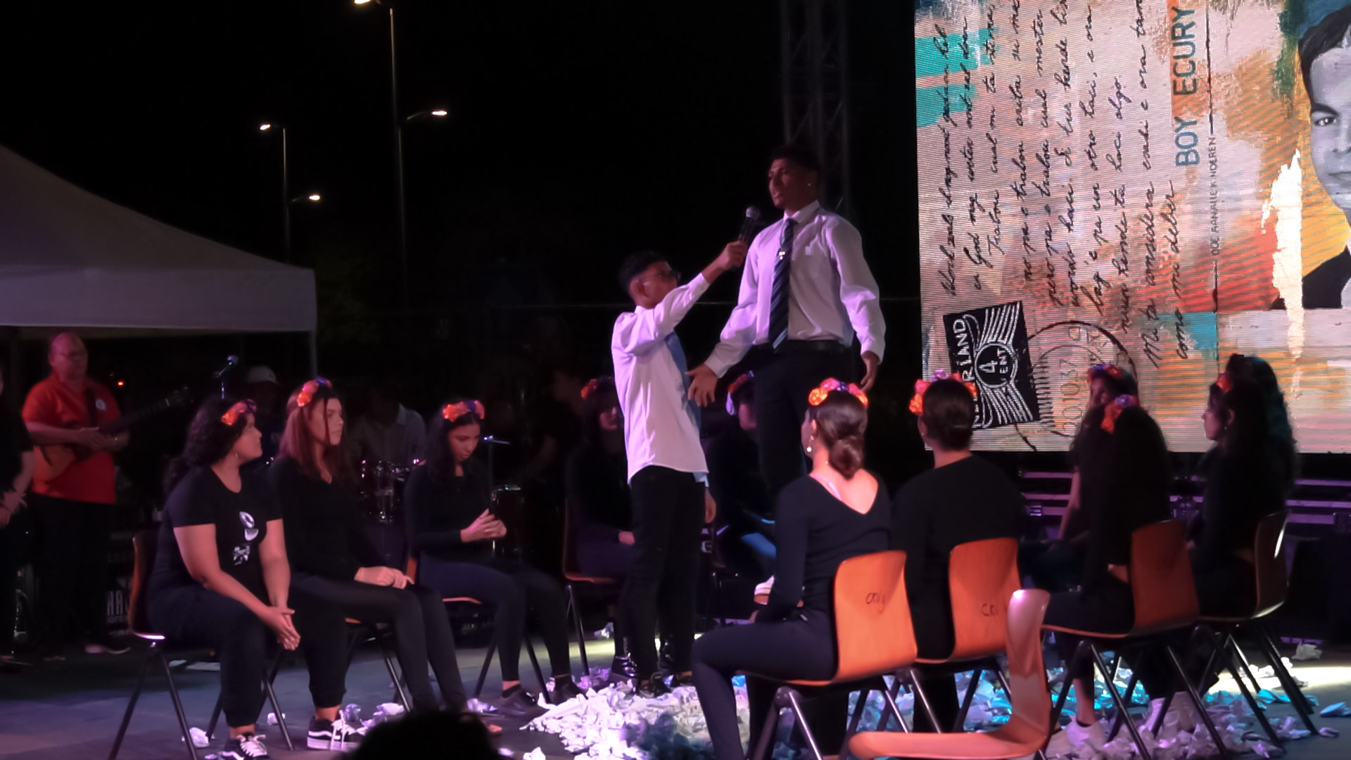 Afterwards, the students and guests walked to the main stage of the ART FAIR, where the students of Colegio San Antonio performed their tableau vivant, musically accompanied by students and teachers from Muchila Creativo. They created this tableau vivant in honor of our hero Boy Ecury with theater coaches Lupita Bernabela and Jhon Freddy Montoya.